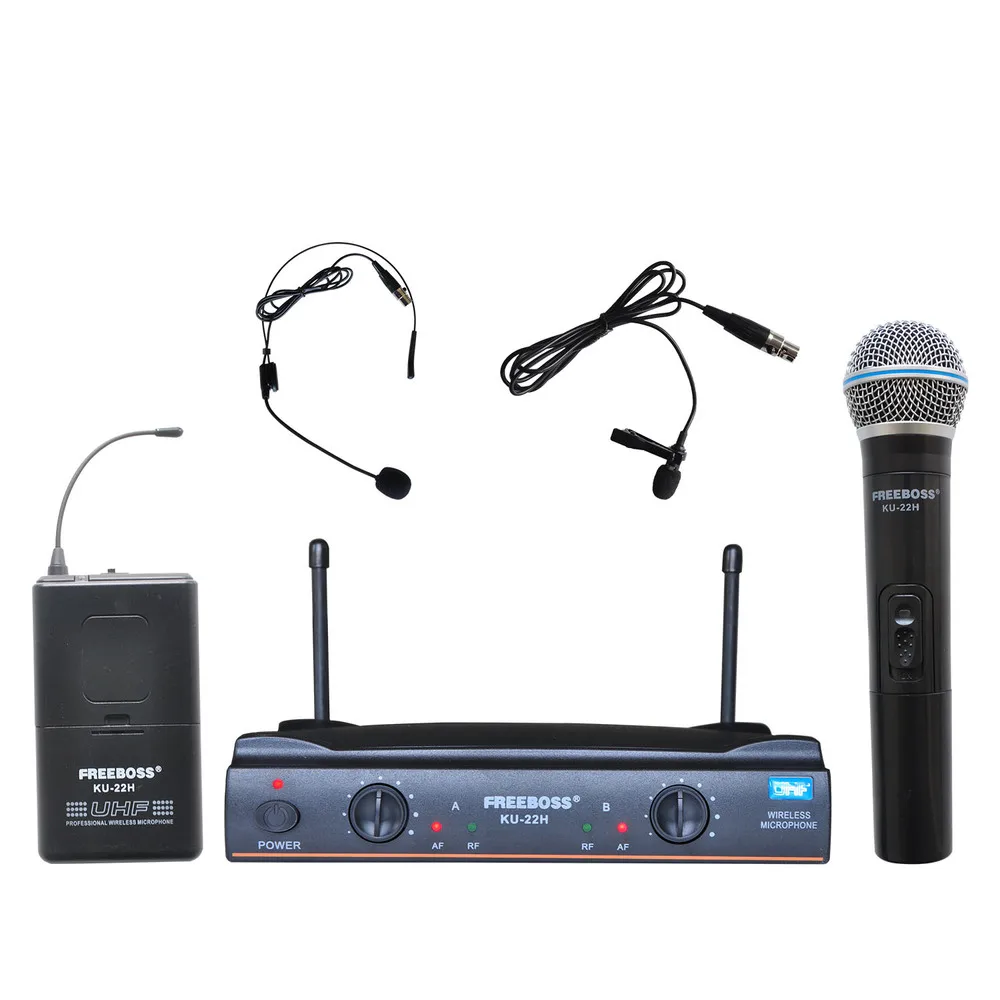 Main Features : Freeboss KU-22H UHF Dual Channel Mic Transmitter Professional Karaoke Wireless Headset + Lapel + Handheld Microphone